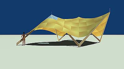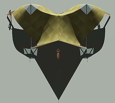 Here's an oblique aerial rendering. You can see the four "peaks" or apexes from this angle clearly. The peak in the middle I've come to call a "horn" because it resembles mountain formations like the Matterhorn in Switzerland in that three inverted cones come together to form the peak. I was pretty confidant that the horn could hold itself up without a tripod support (as in the other 3 peaks). But this was unproven in the field. As you will see in the photos below, the unsuported horn showed no signes of deformation and remained completely stable even with several people standing on it during 40+ mph winds. |