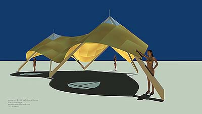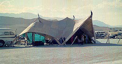 Here's the as-built photo of the conic. The Point Arena Theme Camp (Arena Aquarium) used the Conic as their stage complete with lights, music, dancing, etc. They did some delightful creative things with those lights and canvas walls (see below) including a full-blown go-go cage surrounded with L-wire lights. OK... let's start from the beginning and go through the conic building process in some detail. |