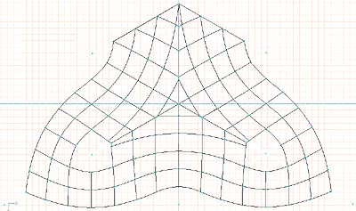 The entire conic was constructed of 4'x4' panels of 1/2" CDX 5 ply plywood. The diagram at left shows the basic layout of these panels. Some panels along the parabolic arch are specially cut to conform to the curve that connects the 4 peaks of the conic. There are a total of 111 individual pieces of plywood and 22 different patterns composing the conic. The top most openings were covered with inexpensive fiberglass sheeting. This created a skylight where the curve was too great for the plywood to bend. |