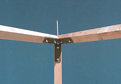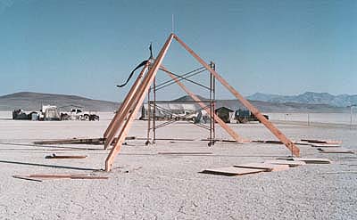 The desert playa was a marvelously flat and plyable surface. Divits in the playa surface held the base of each generator temporarially. Anchor screws were then drilled into the playa to a depth of about 18 inches. About 12" below the surface the playa becomes a thick gooey mud that readily held the base of the anchor screws. To keep the base of the generator poles snug to one another Richie Wasserman used a continuaously threaded 5/8" bolt that carefully runs through the 120 degree spread of the two adjacent generators. |