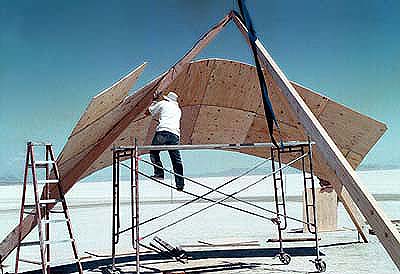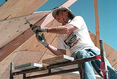 Attaching the panels proceeded smoothly during the second day. A key lesson, however, was just beginning to be learned. Plywood bends across its width much easier than across its length. So the 4'x4' panels would bend much easier in one direction than the other. This was especially important for panels near the vertexes of their respective cones for here the bend is greatest. Orienting the plywood panels properly during prefabrication is a must.