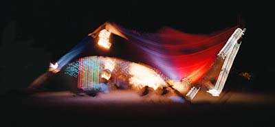 For those of you who might never have been to the Burning Man extravaganza, the final shape of most camps can be quite improvised. The Arena Aquarium was no exception. Tarps where hung, lights attached. A glowing Octopus was suspended from inside and the entire Conic was transformed into a live music stage and dance floor. |
