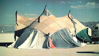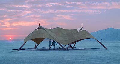 The complete conic shell at sunrise shows the horn with all three parabolic arches connected. There was no deformation out-of-geometry anywhere on the skin surface. I had wanted to perform a test of the horn with a significant live load (like four or five guys all suspended by a rope) but time did not allow. At this point the building crew vacated the Conic and the Arena Aquarium Theme Camp moved in. |